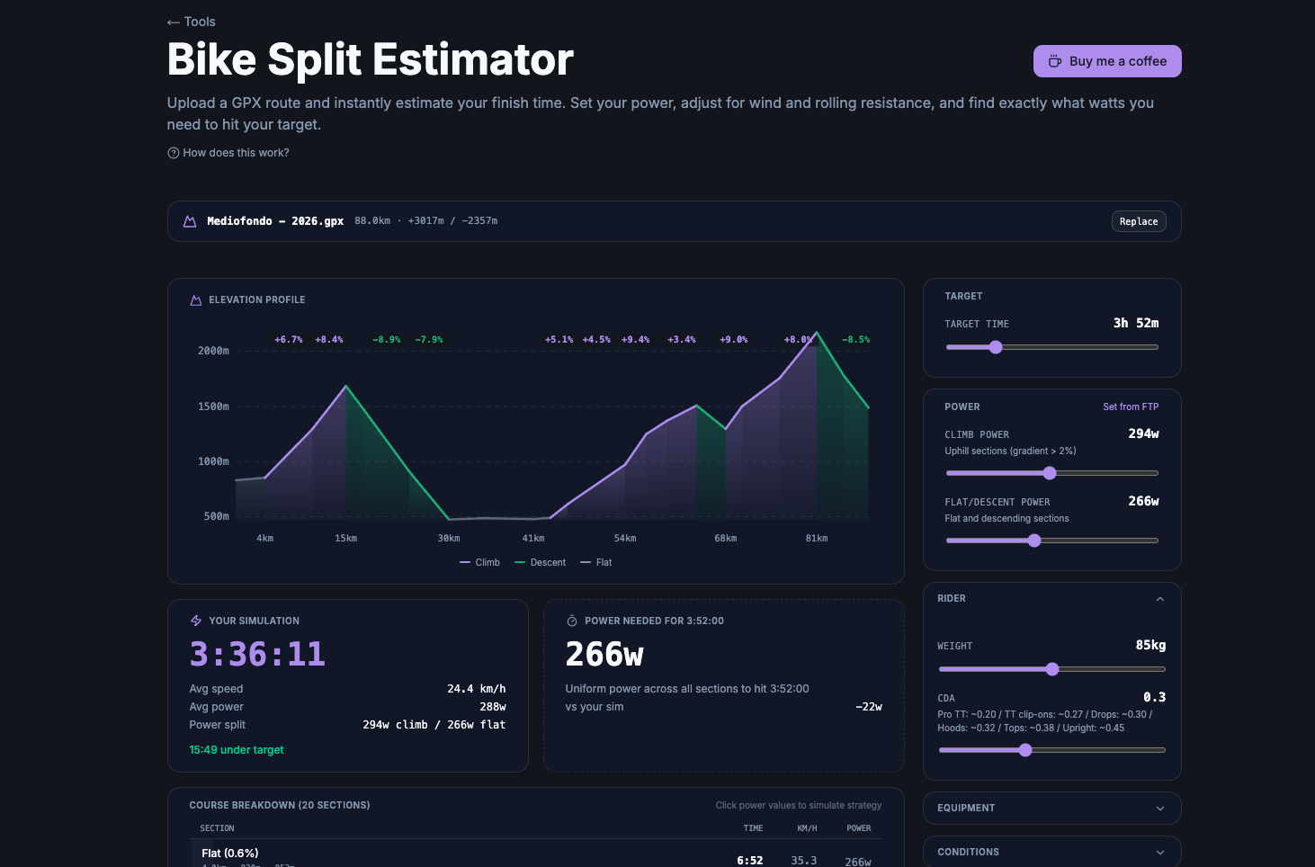 It's built with Next.js, TypeScript, and Tailwind, running entirely client-side. No server, no accounts, no data leaves your browser. The GPX file is parsed in the browser using the DOMParser API, and all the physics runs in JavaScript.