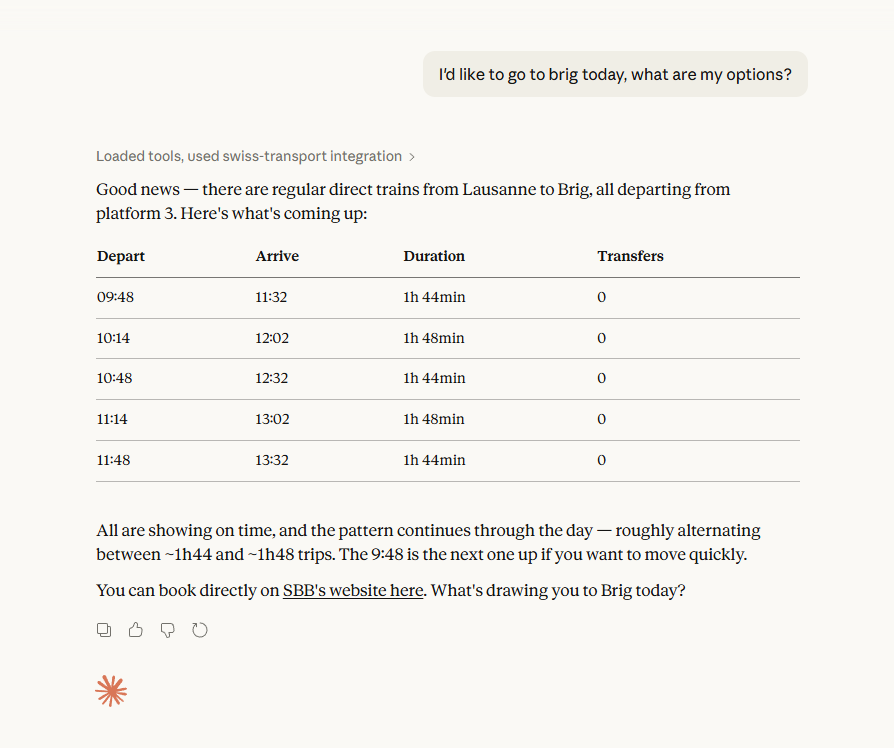 You can ask Claude "How do I get from Lausanne to Brig this morning?" and it'll give you actual, real-time train options, then hand you a link to book.